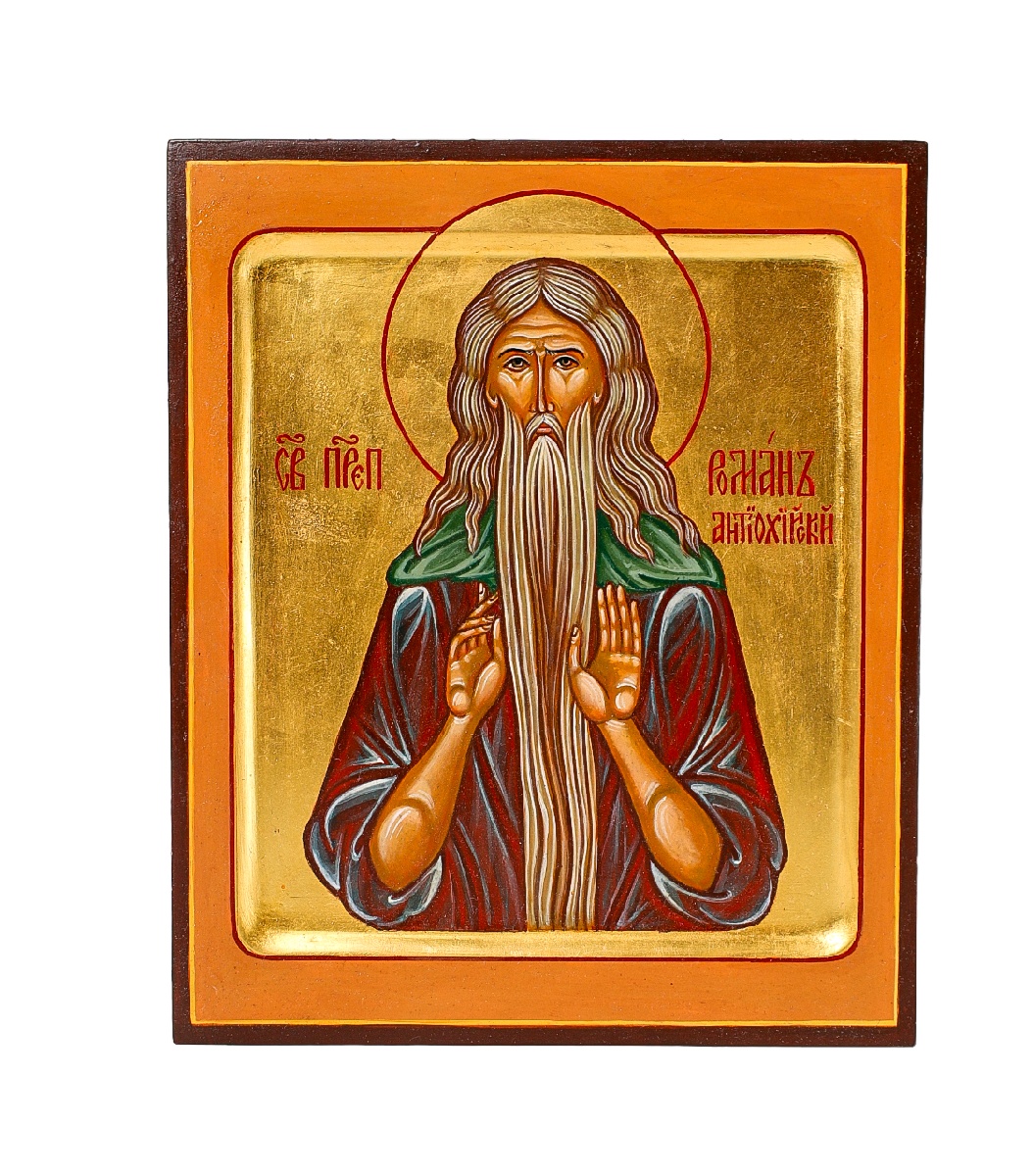 Лик обычно аскетичный, с выраженными чертами строгого постника и отшельника. Черты лица могут быть изможденными, что подчеркивает его подвижнический образ жизни, многолетнее пребывание в затворе. Как и большинство преподобных, Роман Антиохийский изображается в монашеском облачении.