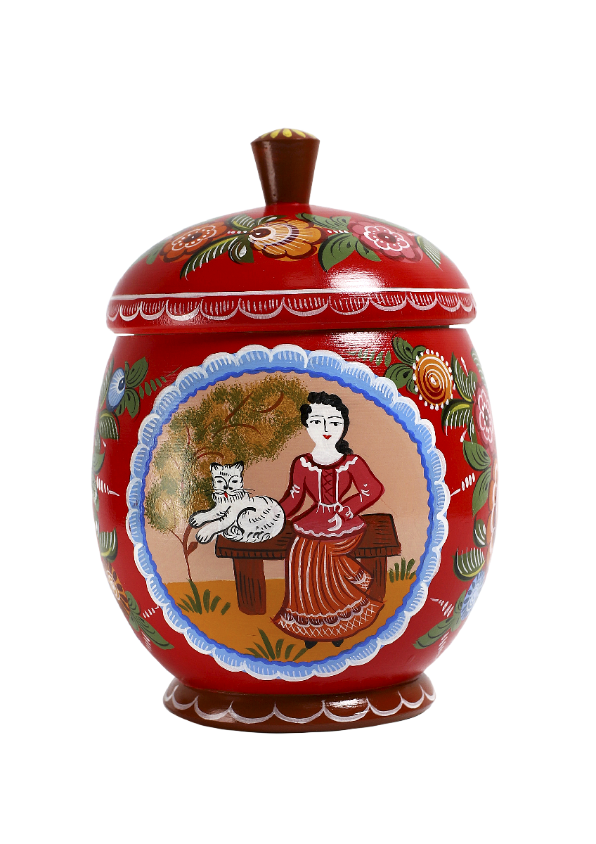 Живые и яркие сюжеты отличают Городецкую роспись от других народных художественных промыслов. На поставе - сцена уютного летнего вечера в сады в компании любимого кота. Каждый поставок расписывается вручную: мастера украшают традиционными узорами, цветами и яркими красками.